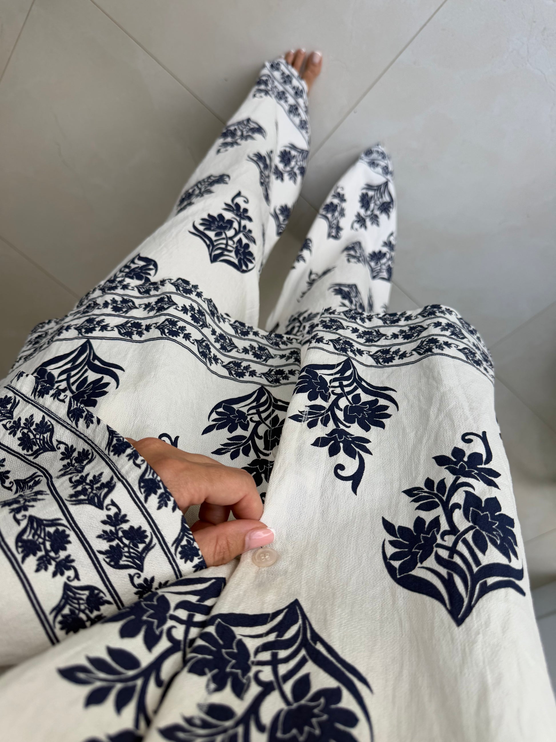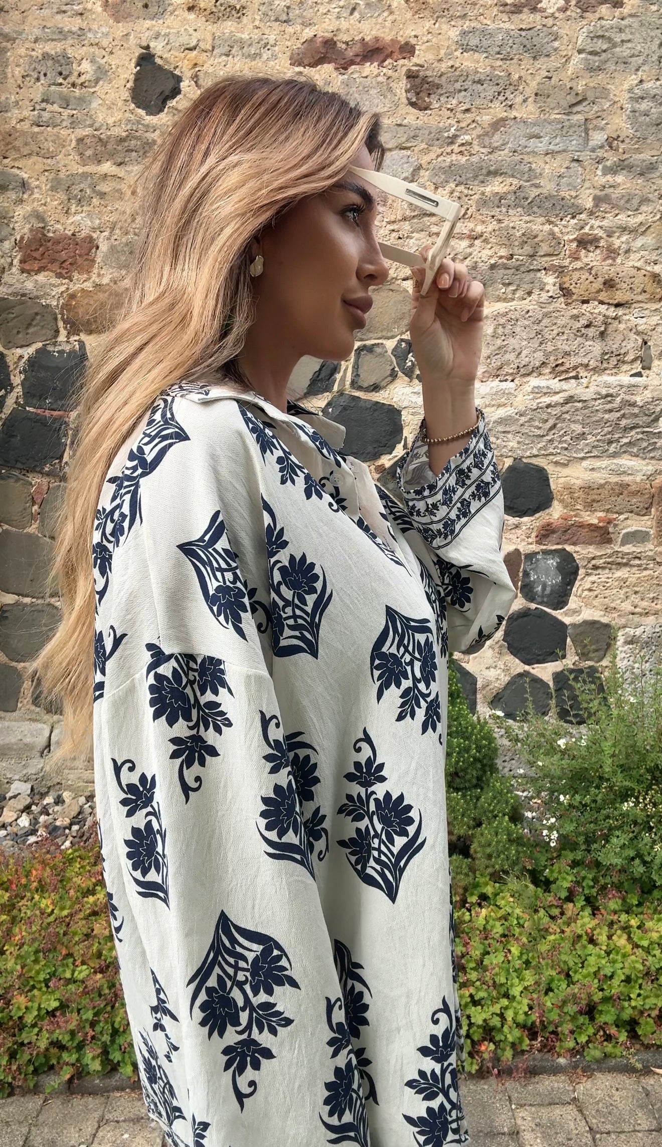 - Edler Kontrast: Weiß mit navy-blauem Muster