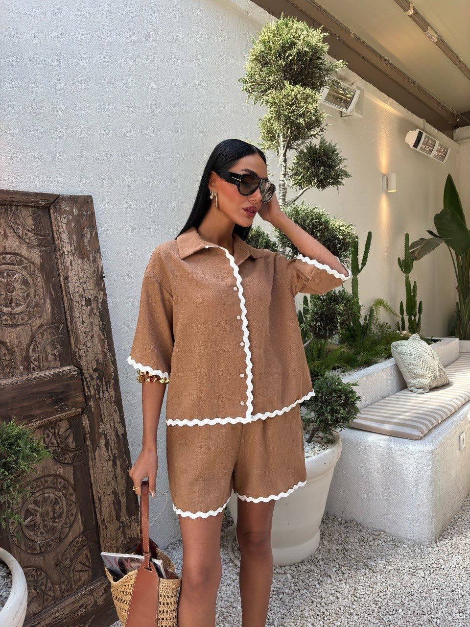 Zweiteiliges Set: Bluse & Shorts mit verspieltem Wellenrand